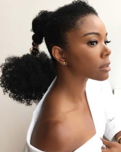 Gabrielle shows off her natural hair with this beautiful and simple curly pony. Tie some extra bands to stand out.